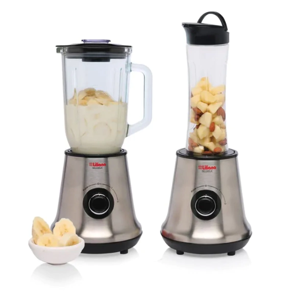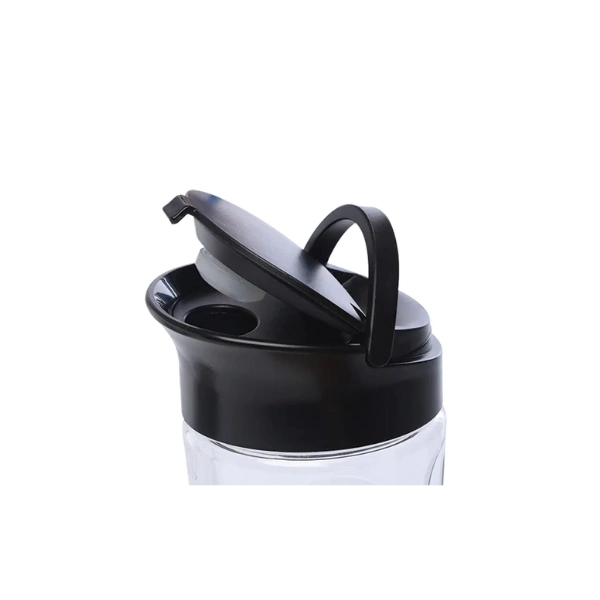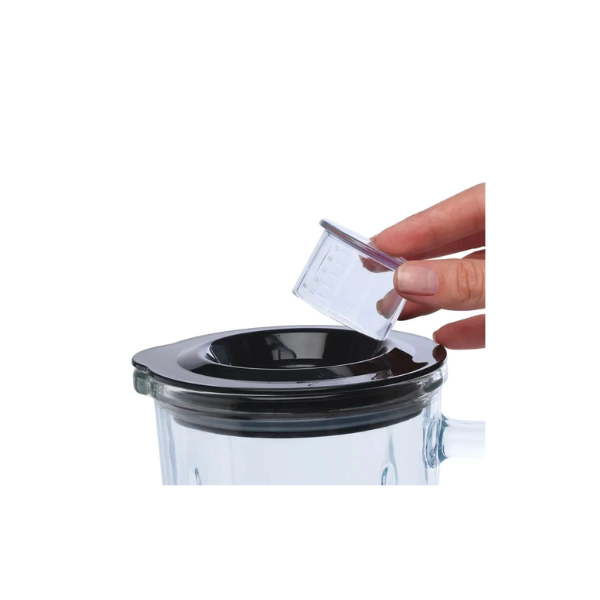 Jarra de vidrio: Capacidad de 1 litro, con tapa para agregar ingredientes en funcionamiento.